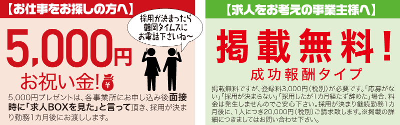 5,000円プレゼントは、各事業所にお申し込み後面接時に「求人BOXを見た」と言って頂き、採用が決まり勤務1カ月後にお渡しします。
